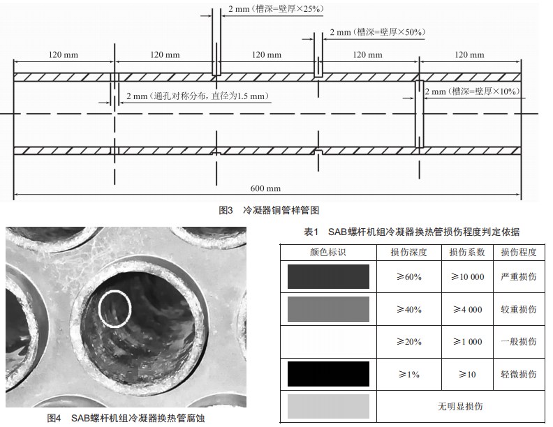 根據(jù)檢測(cè)結(jié)果分析可知,六臺(tái)冷水機(jī)組冷凝器銅管均出現(xiàn)了比較嚴(yán)重的損傷。從損傷換熱表面狀況來分析是海水腐蝕造成的,從腐蝕部位來看,相對(duì)比較集中,大部分位于距離冷凝器銅管管口5cm以內(nèi),且進(jìn)口端腐蝕程度遠(yuǎn)大于混合端,這就表明冷凝器銅管進(jìn)口端受到了海水流速和泥沙的直接沖擊,產(chǎn)生的沖刷腐蝕嚴(yán)重。