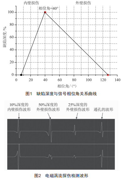 在檢測(cè)中,將檢測(cè)到的缺陷信號(hào)相位角與標(biāo)準(zhǔn)曲線對(duì)照,即可判定缺陷的相對(duì)情況,缺陷位置與信號(hào)相位角關(guān)系曲線如圖1所示。缺陷位置是內(nèi)壁還是外壁須通過相位角來確定,通孔缺陷信號(hào)相位角為40o,相位角小于40o為內(nèi)壁損傷,此時(shí)相位角越大,缺陷深度越大:相位角大于40o則為外壁損傷,此時(shí)相位角越大,缺陷深度越小。不同缺陷深度對(duì)應(yīng)的電磁渦流探傷檢測(cè)波形如圖2所示。