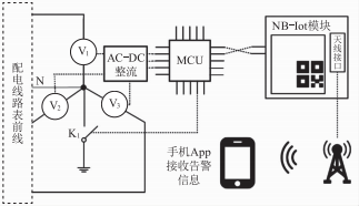 根據(jù)前文所述的斷電檢測法可對MCU進(jìn)行編程,最終以MCU為核心、與其他關(guān)鍵硬件電路所組成的硬件邏輯簡圖如圖2所示。圖2是圖1的后續(xù)部分,其左側(cè)的配電線路表前線即代表了圖1所示的內(nèi)容。前文已提及V1、V2、V3為電壓測量裝置,在實(shí)際應(yīng)用中使用電壓互感器進(jìn)行電壓測量,以便將220V的電壓信號轉(zhuǎn)換成MCU可讀取的小于5V的電壓信號。MCU對整流后的電壓信號進(jìn)行故障檢測,接收到故障信號后發(fā)送信號給NA一Iot模塊,最后由NA一Iot將告警短信發(fā)送至手機(jī)。