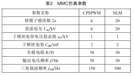 為了進一步說明載波移相調制和最近電平調制方法的特點,在M+AL+T/Simulink中搭建MMC模型,并根據CPSPWM調制方法和NLM調制方法搭建對應的模型。下面對這兩種常見的調制方法進行仿真對比分析,為了清晰地表現(xiàn)CPSPWM和NLM調制方法的特點,在保證輸出電壓頻率相同的工況下,CPSPWM調制方法下單個子模塊的三角載波頻率設置為n·f,因此CPSPWM調制方法子模塊的等效輸出電壓頻率與NLM調制方法的等效輸出電壓頻率相同。MMC仿真參數如表2所示。