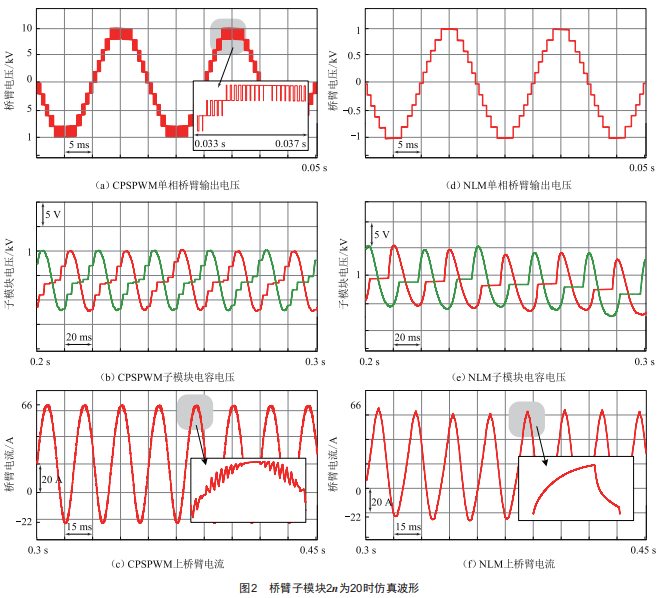 根據圖2仿真結果可以清晰地發(fā)現(xiàn)兩種調制方法的特點:CPSPWM調制方法因為等效開關頻率更高,橋臂輸出電壓波形比NLM調制方法產生的電壓波形表現(xiàn)得更為密集,這也導致CPSPWM調制方法在較多子模塊時或者較高電壓等級時控制子模塊開關比NLM調制方法更為頻繁,從而帶來了更多的開關損耗;CPSPWM需要控制數量較多的載波與調制波進行對比,頻繁地開關子模塊也會帶來子模塊電容電壓的波動、橋臂間環(huán)流的出現(xiàn)等一系列問題。