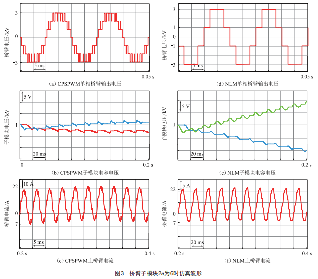 圖3展示了當上下橋臂中只包含3個子模塊時子模塊電容電壓的波動程度,NLM調制方法下子模塊電容電壓逐漸失穩(wěn),橋臂內也因此容易產生環(huán)流等一系列問題,最終影響MMC正常工作,由此可見,NLM調制方法不適用于子模塊數量較少的場合。