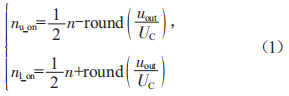 最近電平逼近調制(dearehfLevelMo2ulafion,dLM)的基本思想是通過控制子模塊的導通和關斷盡可能擬合調制波。區(qū)別于CPSPWM是三角載波與調制波比較,NLM是利用函數求解子模塊開關狀態(tài),函數表達形式不同但基本思想都是取整函數,設上橋臂子模塊導通的數量為nuon,下橋臂子模塊導通數量為nlon,根據擬合的思想和取整函數,可以得到上下橋臂子模塊導通數量的表達式為: