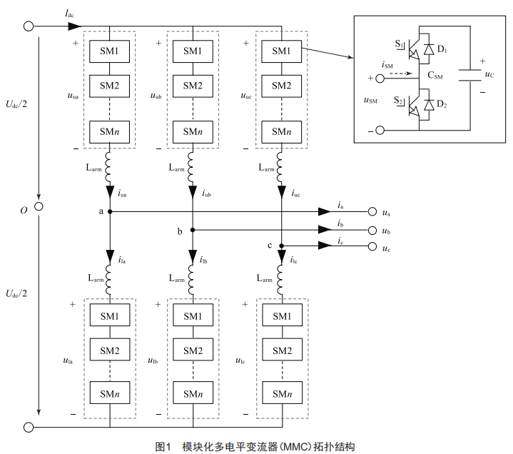 圖1為三相TTC拓撲結構,根據不同的工況需求,常見的多電平變流器拓撲還有單相半橋式和單相全橋式。三相TTC拓撲結構由.個相單元組成,每相由上下兩個橋臂組成,每個橋臂由n個子模塊(ST)和橋臂電感(Larm)構成,圖1中子模塊為常見的半橋型子模塊。Udc表示TTC的直流側電壓:uix表示第x相的i橋臂的橋臂電壓,其中i=u或l,u表示上橋臂,l表示下橋臂,x=a、b或c,a、b、c分別表示A、B、C相:iix表示流過第x相的i橋臂的橋臂電流:ux表示第x相的交流側相電壓:ix表示第x相的交流側相電流:0表示零點位參考點。
