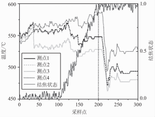 水冷壁超溫爆管的關(guān)鍵原因在于水冷壁結(jié)焦,根據(jù)結(jié)焦與爆管之間的關(guān)聯(lián)關(guān)系,同時(shí)結(jié)合運(yùn)行人員經(jīng)驗(yàn),對(duì)水冷壁結(jié)焦?fàn)顟B(tài)進(jìn)行標(biāo)注,結(jié)焦?fàn)顟B(tài)數(shù)值在0和1之間,0表示沒(méi)有結(jié)焦或結(jié)焦輕微,1表示嚴(yán)重結(jié)焦。為了模擬鍋爐燃燒對(duì)結(jié)焦?fàn)顟B(tài)的動(dòng)態(tài)影響,在標(biāo)注數(shù)據(jù)中引入了高斯噪聲。然后,基于嵌入式特征選擇方法,使用梯度提升決策樹(GradientBooStingDeciSionTree,GBDT)模型作為特征篩選模型,結(jié)合標(biāo)注數(shù)據(jù),篩選出特征重要性較高的4個(gè)壁溫測(cè)點(diǎn)。如圖1所示,實(shí)驗(yàn)截取正常運(yùn)行和超溫爆管前后總計(jì)300個(gè)采樣點(diǎn)作為訓(xùn)練和測(cè)試數(shù)據(jù)集,在第200個(gè)采樣點(diǎn)時(shí)爆管發(fā)生。