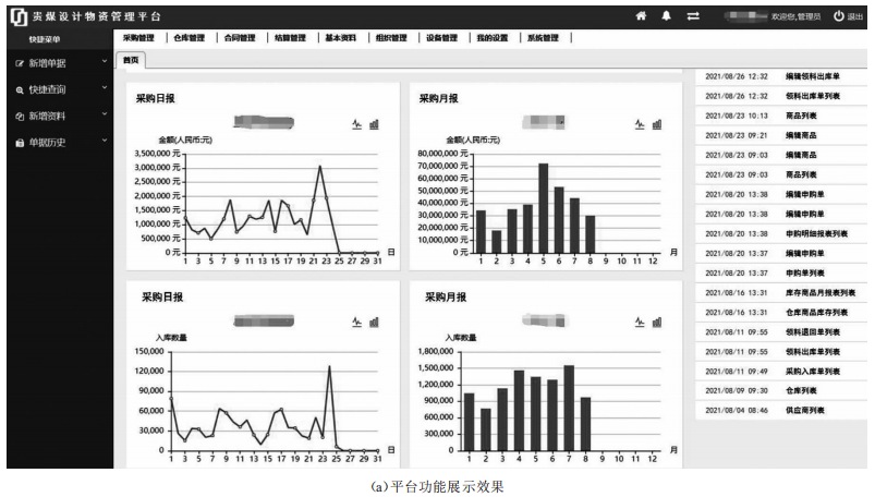 目前,煤礦企業(yè)物資管理信息化平臺(tái)已在貴州某煤礦集團(tuán)公司及下屬煤礦企業(yè)投入應(yīng)用,經(jīng)過一年多的使用,平臺(tái)運(yùn)行穩(wěn)定可靠,可為集團(tuán)公司減少因設(shè)備重復(fù)采購(gòu)造成的資源浪費(fèi),實(shí)現(xiàn)了資金流和物流的閉環(huán)控制,采購(gòu)流程自動(dòng)化,減少了庫(kù)存物資積壓,避免了物資多次重復(fù)采購(gòu)的現(xiàn)象,消除了集團(tuán)部門或下屬煤礦企業(yè)之間銜接不到位等問題??傮w而言,平臺(tái)在集團(tuán)公司及下屬煤礦企業(yè)應(yīng)用效果良好。平臺(tái)效果展示如圖4所示。