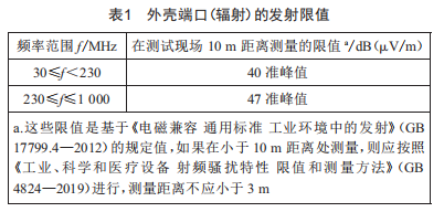 在裝置或裝置組合的每個外殼端口(輻射)測量的電磁發(fā)射水平不應(yīng)超過表1規(guī)定的限值。