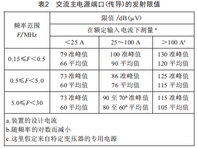 對于電壓有效值l000V以下的裝置或裝置組合,在其每個交流主電源端口測量的電磁發(fā)射水平不應(yīng)超過表2規(guī)定的限制。