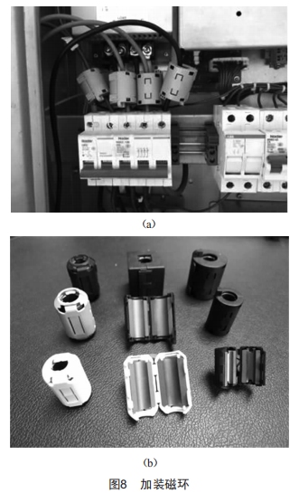 在電梯設(shè)備上加裝濾波器、磁環(huán)等也是有效和常見的電磁兼容設(shè)計(jì)手段。磁環(huán)用于吸收系統(tǒng)中多余的能量,并對多余的無價值的干擾進(jìn)行過濾,從而避免了電梯在使用過程中受到來自其他設(shè)備的不同頻段的電磁干擾影響。濾波就是對不需要的傳導(dǎo)性電磁干擾進(jìn)行抑制,濾波器實(shí)際上是一種過濾裝置,通常是由電感器、電容器、電阻器組成的濾波電路,將電梯系統(tǒng)不希望的頻率有效濾除。通常在主開關(guān)進(jìn)線端、變頻器輸出側(cè)加裝磁環(huán),能較好地解決電磁干擾問題,如圖8所示。當(dāng)然,根據(jù)線纜所連接的位置的不同、頻率的不同,可以更進(jìn)一步地精細(xì)化選擇磁環(huán)的型式,比如非晶磁環(huán)、錳鋅磁環(huán)、鎳鋅磁環(huán)。