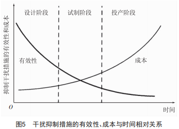 對電梯電磁兼容的改進(jìn)措施主要從抑制騷擾源、切斷騷擾耦合途徑、提高敏感設(shè)備的抗擾度三個方面進(jìn)行考慮[4-7],即分析電磁騷擾源、耦合路徑和敏感設(shè)備,并采取有效的技術(shù)手段。電梯電磁兼容的改善貫穿電梯的全生命周期,當(dāng)然,在電梯的設(shè)計(jì)階段采取合理的防干擾措施有效性最高,需要的成本也最低,如圖5所示。
