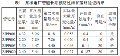 根據(jù)某核電廠JPP系統(tǒng)重點(diǎn)管道的兩次跟蹤測(cè)厚數(shù)據(jù),前期制訂的維護(hù)策略所基于的評(píng)估腐蝕速率足夠保守,可以包絡(luò)管道實(shí)際的磨損減薄情況。因此,長期預(yù)防性維護(hù)策略的初始周期是合理的,可以此為基礎(chǔ),對(duì)聯(lián)合泵房?jī)?nèi)的管道開展長期的預(yù)防性維護(hù)工作。