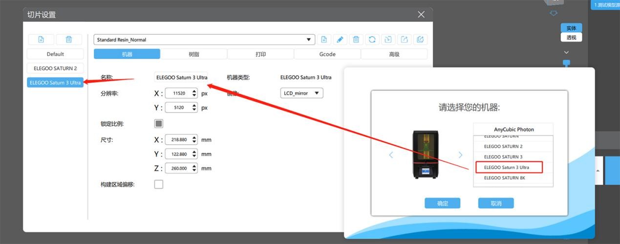 打開軟件,首先需要在切片設置里添加新機器,選擇ELEGOO品牌,并選擇土星3U,點擊確認即可。