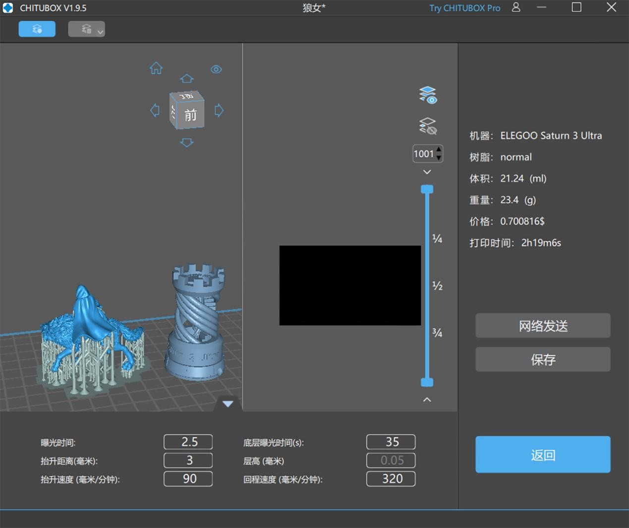 添加完成后,就點擊右邊的切片按鍵,那么軟件就會自動切片,隨后,我們就可以把切片好的3D文件保存到U盤。值得一提的是,土星3U可通過CHITUBOX Basic V1.9.5最新版本軟件實現(xiàn)無線WiFi傳輸,不用插U盤也可以傳輸文件,傳輸速度6-10Mbps,兼容2.4G和5G網(wǎng)絡,更加方便用戶快速打印。