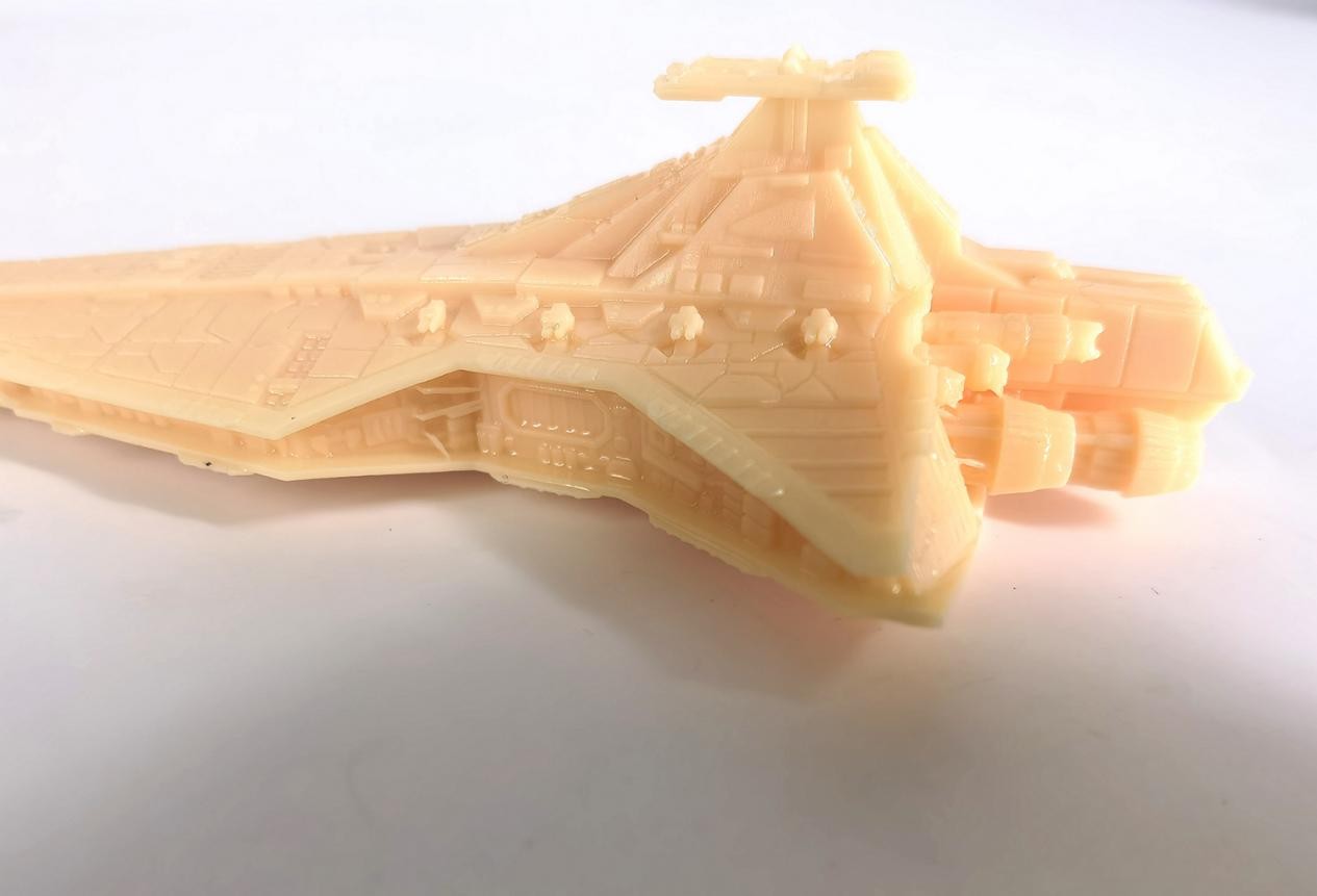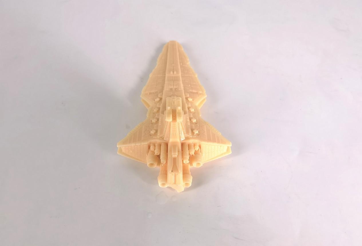 接著,在ELEGOO土星3U上還打印了一艘飛船,完整打印,飛船船身的紋理細節(jié)纖毫畢現(xiàn),體現(xiàn)了良好的打印品質。需要留意的是,土星3U采用升級COB+折射光源設計方案,光源由144顆高度集成的UV LED燈組成,工作5000小時光衰保持在5%以內(nèi),405nm波長的均勻光束,0.05%雜散光系數(shù)92%光場均勻性,能夠使打印模型細節(jié)更精細,更逼真。