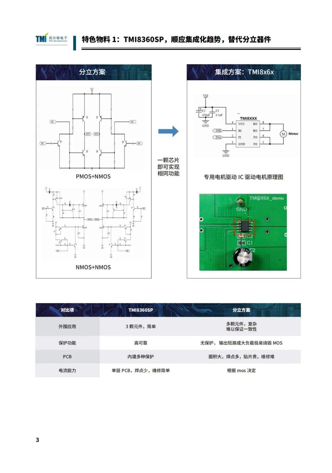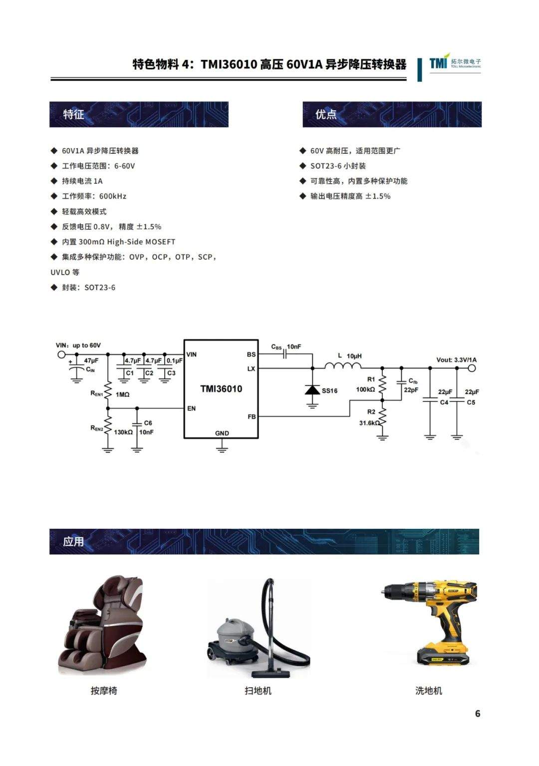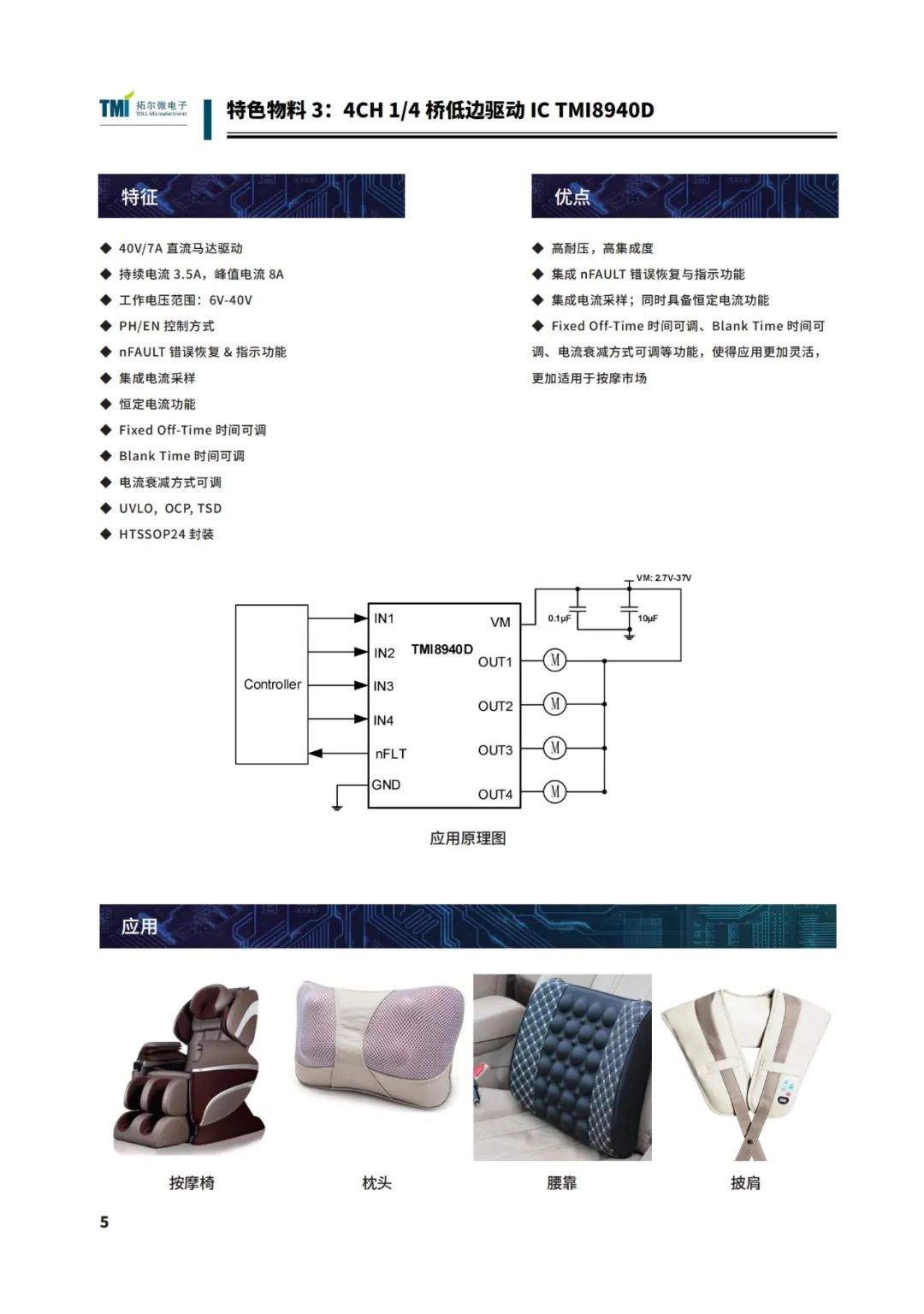 想要產(chǎn)品實力好,芯片解決方案至關(guān)重要!拓爾微在芯片領(lǐng)域有多年積累與沉淀,已有多款電源管理芯片、馬達驅(qū)動芯片,充電&霍爾開關(guān)等形成全套按摩椅解決方案。為滿足市場上各類按摩椅產(chǎn)品設(shè)計的選型需求,為客戶提供一站式優(yōu)質(zhì)服務(wù),我們推出了按摩椅專題期刊——本期刊重點介紹了按摩椅系列拓爾BOM方案,物料清單及5款特色物料,包括產(chǎn)品的特點、應(yīng)用注意事項、適用場景等——TMI8360SP替代繼電器方案和分立器件方案、40V3.5A直流馬達驅(qū)動IC-TMI8130、4CH 1/4橋低邊驅(qū)動IC TMI8940D、TMI36010高壓60V1A異步降壓轉(zhuǎn)換器、3W單通道D類音頻功放TMS8010/TMS8020。