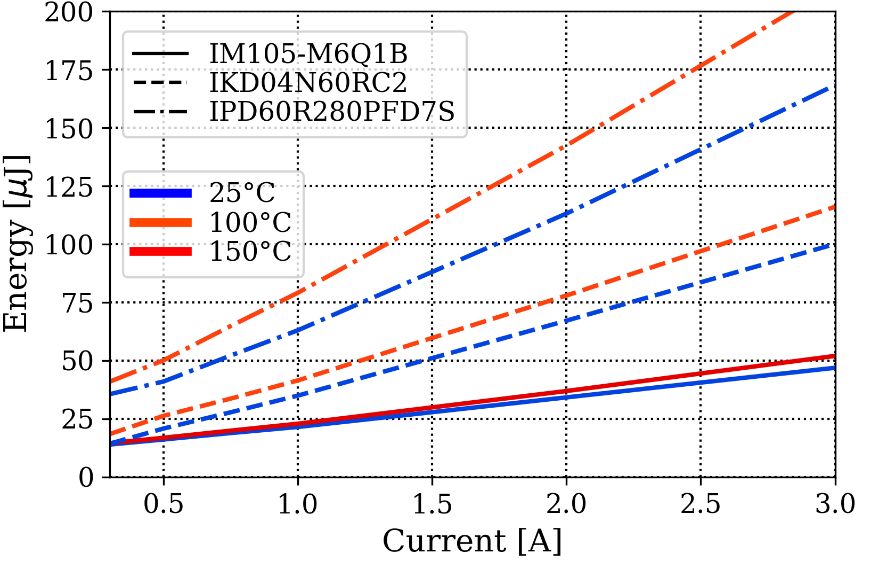 測(cè)試表明,相比于IKD04N60RC2,特別是相比于IPD60R280PFD7S,IM105-M6Q1B的功率損耗低得多,其功率損耗主要取決于導(dǎo)通損耗。最后,IM105-M6Q1B的動(dòng)態(tài)損耗對(duì)溫度的依賴性可以忽略不計(jì),而其他器件,哪怕當(dāng)Tj=100°C時(shí),損耗也開(kāi)始顯著增加。