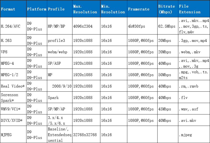 VPU可以提供高效、低功耗的視頻編解碼處理能力,主要功能包括視頻編碼、解碼、圖像處理、視頻輸出等。它可以支持多種視頻編碼格式,如H.264、H.265、VP9等,同時(shí)還可以支持多種分辨率和幀率的視頻處理。其中D9-Pro支持4Kp30視頻播放,D9-Plus、D9支持1080p60視頻播放。