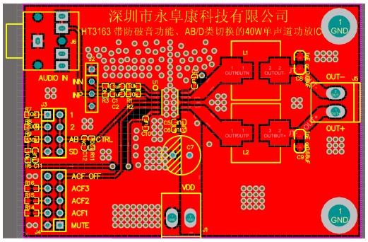 HT3163 寬電壓3V-18V供電、AB/D類切換40W單聲道音頻功放IC應(yīng)用方案