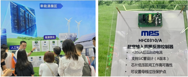 展出的儲能全套方案包含MP279x系列AFE,配合100VBuck MP458x系列;以及10ACC Buck實現(xiàn)48V電池包直接并聯(lián)時的限流方案;MP279x配合HFC0310反激芯片則可以實現(xiàn)高壓家儲的整體方案。