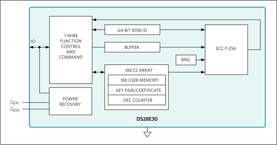 該器件提供一組源自集成塊的核心加密工具,包括非對稱硬件引擎、真隨機數(shù)生成器(TRNG)、3Kb安全EEPROM、遞減計數(shù)器和唯一的64位ROM標(biāo)識號(ROM ID)。ECC公鑰/私鑰功能根據(jù)NIST定義的P-256曲線運行,以提供符合FIPS186的ECDSA簽名生成功能,以支持雙向非對稱密鑰身份驗證模型,擁有強大的對策防止安全攻擊。