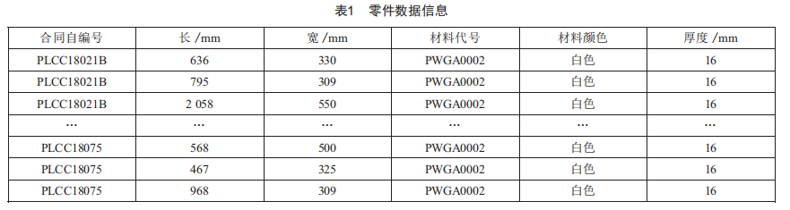 根據(jù)某制定化企業(yè)的生產(chǎn)情況,選取了5個(gè)不同批次的生產(chǎn)訂單,為滿(mǎn)足零件排樣要求,將所有訂單數(shù)據(jù)按照零件尺寸、材料進(jìn)行整理,表1為其中一個(gè)批次的部分訂單數(shù)據(jù)信息。