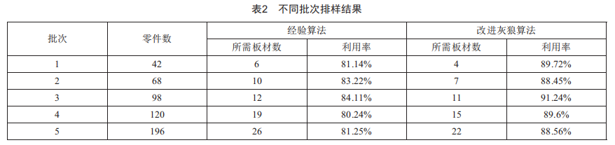 在不同的排樣批次中,為了較充分地比較算法的有效性,分別選取了不同零件規(guī)模的算例,零件個(gè)數(shù)從42個(gè)到196個(gè)不等,將本文中的改進(jìn)灰狼算法和企業(yè)訂單分批后所使用的經(jīng)驗(yàn)算法進(jìn)行比較,板材利用率均有不同程度的提升,分別提升了8.58%、5.23%、7.13%、9.36%和7.31%,對(duì)應(yīng)批次所需板材的數(shù)量分別減少2、3、1、4和4塊。改進(jìn)的灰狼算法較經(jīng)驗(yàn)算法利用率有較大的提升,減少了企業(yè)生產(chǎn)成本,提高了企業(yè)的生產(chǎn)效益。
