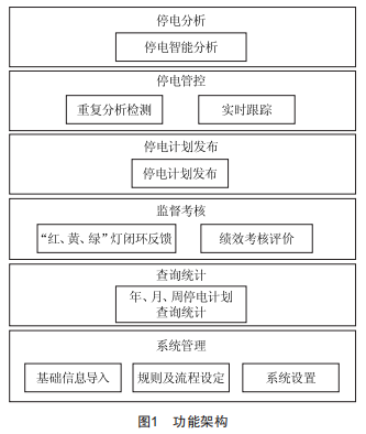 系統(tǒng)功能架構(gòu)主要包括停電分析、停電管控、停電計劃發(fā)布、監(jiān)督考核、查詢統(tǒng)計、系統(tǒng)管理6個部分,如圖1所示。