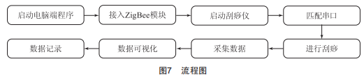 圖6展示的是刮痧儀動態(tài)監(jiān)測系統(tǒng)的實驗平臺,分別由上位機(電腦)、傳輸設備ZigBee、刮痧儀本體和可替換的刮板頭組成。具體操作流程如圖7所示。
