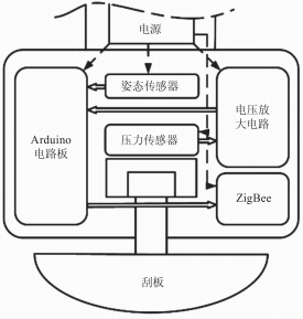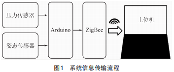 本文設計的智能刮痧儀采用一體化集成設計,由Arduino板、壓力傳感器、姿態(tài)傳感器、ZigBee無線傳輸模塊、系統(tǒng)電源等組成,能實時監(jiān)測、記錄并上傳刮痧儀在使用者刮痧過程中的速度、壓力及傾斜角,以實現(xiàn)對刮痧操作的量化和數(shù)據(jù)化。信息傳輸流程如圖1所示。