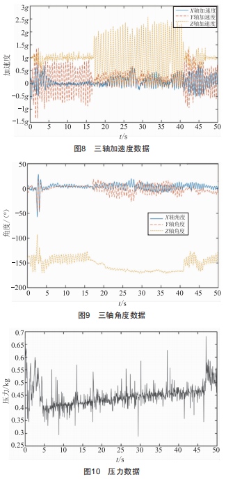 啟動電腦端程序和刮痧儀后,將ZigBee模塊接入電腦并與刮痧儀的串口匹配。確認刮痧儀已與電腦連接后,進行正常的刮痧操作。其間壓力傳感器將持續(xù)采集信息,并將采集到的壓力信息經(jīng)過電壓放大電路進行放大后傳輸給單片機,姿態(tài)傳感器將加速度及旋向等數(shù)據(jù)傳給單片機,單片機把這些數(shù)據(jù)處理后通過ZigBee傳給上位機,并通過上位機程序將數(shù)據(jù)可視化顯示出來,如圖8、圖9、圖10所示。