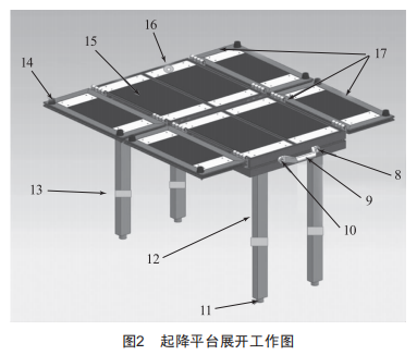 5為防震緩沖鈕,配合起降平臺主體4展開后,起到支撐、防震、保護(hù)作用。