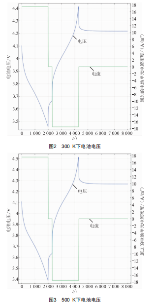 此模型研究了在300K和500K下電池電壓的曲線圖像,如圖2、圖3所示。