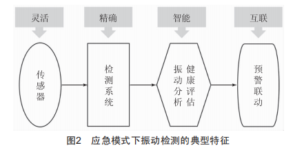 應(yīng)急檢測(cè)模式是一種全新的智能檢測(cè)模式,利用現(xiàn)代傳感技術(shù)提高測(cè)量的精度和適應(yīng)性,采用智能數(shù)據(jù)分析算法提供強(qiáng)大的邊緣計(jì)算能力,以通信信息平臺(tái)為支撐,運(yùn)用大數(shù)據(jù)、人工智能、云計(jì)算等前沿技術(shù)深入挖掘監(jiān)測(cè)數(shù)據(jù)價(jià)值,將數(shù)據(jù)轉(zhuǎn)換為有效信息,實(shí)現(xiàn)一體化融合預(yù)警聯(lián)動(dòng)。應(yīng)急模式下的振動(dòng)檢測(cè)應(yīng)該具有如下典型特征(圖2):