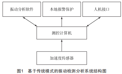 圖1為基于傳統(tǒng)模式的振動(dòng)檢測(cè)分析系統(tǒng)典型結(jié)構(gòu)框圖,系統(tǒng)主要由磁吸式加速度傳感器、測(cè)控計(jì)算機(jī)、振動(dòng)分析軟件、人機(jī)接口、本地報(bào)警保護(hù)單元等組成。振動(dòng)傳感器采用磁吸方式與被測(cè)對(duì)象接觸安裝,通過(guò)采集加速度二次信號(hào),間接感知被測(cè)對(duì)象的振動(dòng)信息:測(cè)控計(jì)算機(jī)內(nèi)置振動(dòng)分析軟件,實(shí)現(xiàn)振動(dòng)信號(hào)采集、數(shù)據(jù)處理、狀態(tài)評(píng)估等功能:人機(jī)接口主要包括鍵盤(pán)、鼠標(biāo)、顯示器等,負(fù)責(zé)實(shí)時(shí)顯示振動(dòng)參數(shù)、時(shí)域波形和頻域圖譜:報(bào)警及保護(hù)單元負(fù)責(zé)本地聲光報(bào)警及保護(hù)輸出,確保設(shè)備安全運(yùn)行。