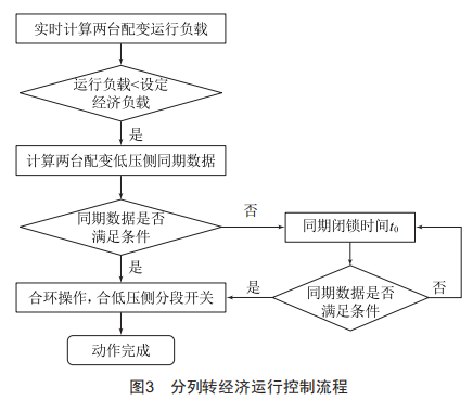 動作過程如下:在系統(tǒng)充電狀態(tài)下,當(dāng)兩臺變壓器疊加負(fù)載小于經(jīng)濟(jì)運(yùn)行負(fù)載,持續(xù)時(shí)間大于啟動經(jīng)濟(jì)運(yùn)行時(shí)間后,啟動變壓器分列運(yùn)行轉(zhuǎn)至經(jīng)濟(jì)運(yùn)行動作。具體動作流程如圖3所示。