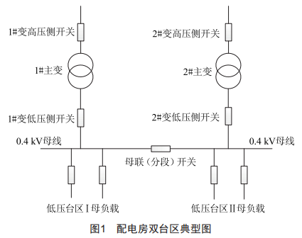 目前,新建住宅配電房主要采用的是雙臺區(qū)設(shè)計(jì),即配電房配備兩臺變壓器,由兩條來自不同電源的10kV線路供電,兩路電源分列運(yùn)行,各自帶低壓負(fù)載。圖1為主流的雙臺區(qū)典型設(shè)計(jì)架構(gòu)。