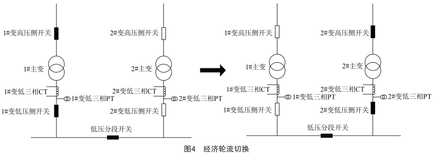 在運(yùn)行過程中,實(shí)時(shí)判定工作主變低壓側(cè)負(fù)載。當(dāng)負(fù)載在一段時(shí)間內(nèi)持續(xù)小于變壓器經(jīng)濟(jì)負(fù)載占比時(shí),啟動變壓器輪流切換功能,如圖4所示。在切換過程中,保證低壓側(cè)母線不失電,同時(shí)保證合環(huán)運(yùn)行時(shí)間小于200ms,避免兩臺變壓器長時(shí)間合環(huán)運(yùn)行造成其他不良影響。