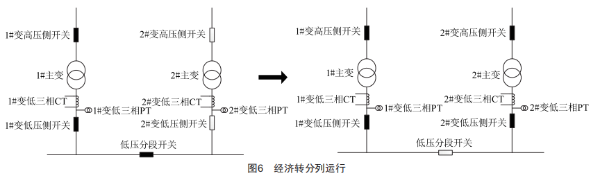 在運(yùn)行過程中,實(shí)時(shí)判定工作主變低壓側(cè)負(fù)載。當(dāng)負(fù)載在一段時(shí)間內(nèi)持續(xù)大于變壓器經(jīng)濟(jì)負(fù)載時(shí),啟動變壓器經(jīng)濟(jì)運(yùn)行轉(zhuǎn)分列運(yùn)行功能,如圖6所示。在切換過程中,保證低壓側(cè)母線不失電,同時(shí)保證合環(huán)運(yùn)行時(shí)間小于200ms。