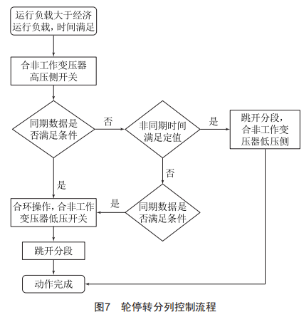 動作過程如下:在充電狀態(tài)下,當(dāng)工作變壓器持續(xù)工作負(fù)載大于經(jīng)濟(jì)運(yùn)行負(fù)載,持續(xù)時(shí)間大于返回分列運(yùn)行時(shí)間后,啟動變壓器經(jīng)濟(jì)運(yùn)行轉(zhuǎn)至分列運(yùn)行動作。具體動作流程如圖7所示。