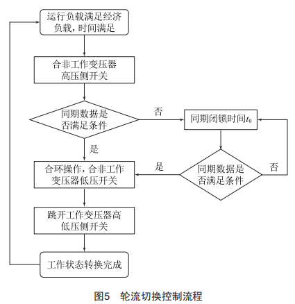 動作過程如下:在充電狀態(tài)下,當(dāng)工作變壓器持續(xù)工作滿足變壓器輪換時(shí)間,并且工作變壓器負(fù)載始終小于經(jīng)濟(jì)運(yùn)行負(fù)載后,啟動變壓器輪流運(yùn)行。具體動作流程如圖5所示。
