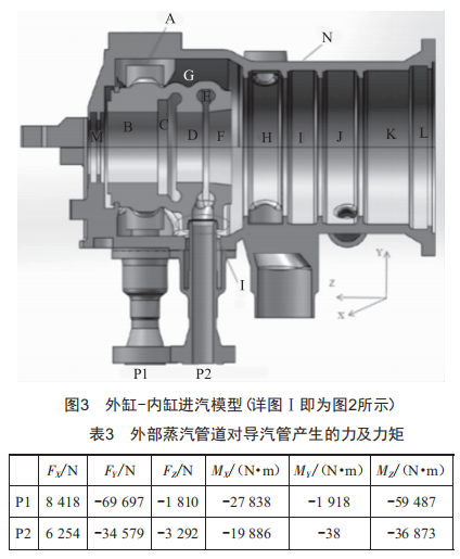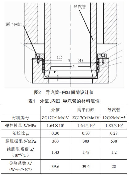 蒸汽通過導(dǎo)汽管進(jìn)入兩半內(nèi)缸,導(dǎo)汽管固定在外缸上,另一端與外接蒸汽管道相連。導(dǎo)汽管與內(nèi)缸相接處存在理論設(shè)計(jì)間隙,如圖2所示。若外接管道對(duì)內(nèi)缸產(chǎn)生附加的力和力矩過大,使得間隙超過理論值,就會(huì)影響內(nèi)缸正常工作,因此,需要對(duì)模型進(jìn)行分析。模型中,外缸、內(nèi)缸、導(dǎo)汽管的材料屬性如表1所示,外缸、內(nèi)缸各個(gè)腔室蒸汽參數(shù)如表2所示,外缸-內(nèi)缸進(jìn)汽模型如圖3所示。同時(shí),加載外部蒸汽管道因熱變形對(duì)導(dǎo)汽管產(chǎn)生的反作用力及力矩,力及力矩?cái)?shù)值如表3所示。