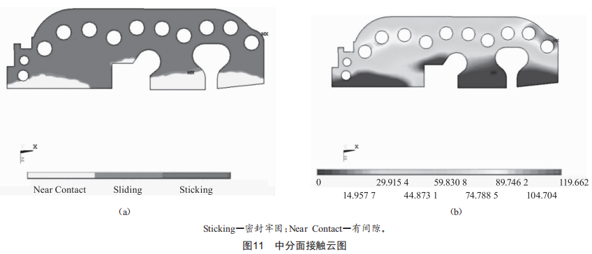 圖11(a)、圖11(b)的分析結(jié)果表明,內(nèi)缸中分面大部分區(qū)域能保持較高的接觸壓力。因內(nèi)缸本身結(jié)構(gòu)限制,靠近內(nèi)缸腔室附近密封性較差,但中分面螺栓處密封很好,所以漏氣概率較小,氣密性良好。