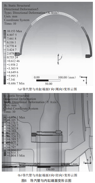 從圖2可知,導(dǎo)汽管與內(nèi)缸間隙設(shè)計(jì)值為周向4mm、徑向7mm。圖6(a)、圖6(b)有限元分析結(jié)果表明,周向相對(duì)變形為1.4mm以內(nèi),小于間隙設(shè)計(jì)值4mm:徑向相對(duì)變形在1mm內(nèi),也遠(yuǎn)小于設(shè)計(jì)間隙7mm??梢哉f,在最大蒸汽參數(shù)工況下,現(xiàn)有設(shè)計(jì)的間隙值能滿足機(jī)組安全運(yùn)行要求。