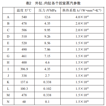 在不同的運(yùn)行工況下,內(nèi)缸的溫度場(chǎng)差別很大。為了簡(jiǎn)化分析,下面僅研究最大工況時(shí)且處于穩(wěn)定對(duì)流換熱狀態(tài)下內(nèi)缸的溫度場(chǎng)。在穩(wěn)定運(yùn)行時(shí),蒸汽主要是以對(duì)流換熱方式向金屬傳熱,換熱量與換熱系數(shù)和換熱溫差成正比。內(nèi)缸金屬內(nèi)部以導(dǎo)熱的方式進(jìn)行熱量傳遞。