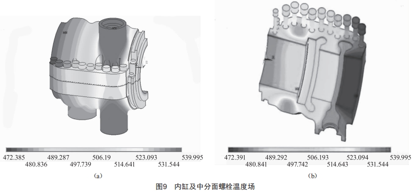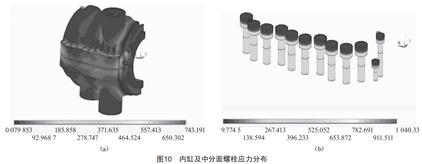 圖9(a)、圖9(b)的分析結(jié)果表明,內(nèi)缸溫度梯度呈軸向分布,且在同一軸向截面上溫度分布均勻:內(nèi)缸中分面螺栓的溫度梯度呈垂直分布,且溫度分布均勻,這有利于螺栓保持較高的預(yù)緊力。圖10(a)、圖10(b)的分析結(jié)果表明,除了部分應(yīng)力集中處外,內(nèi)缸的應(yīng)力均在200MPa以內(nèi),且中分面螺栓應(yīng)力主要處于400MPa以內(nèi)。數(shù)值均小于對(duì)應(yīng)材料的屈服極限,校核安全。
