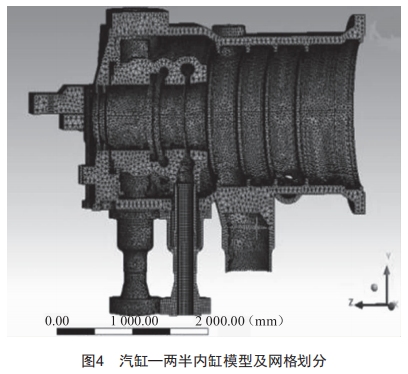 內(nèi)缸大部分都是以水平中分面為基準(zhǔn)分成上下兩半,并由外缸水平中分面支承,頂部和底部由定位銷導(dǎo)向確保與汽輪機(jī)軸線保持正確位置。設(shè)計(jì)時(shí),為了滿足蒸汽流動(dòng)要求,內(nèi)缸通常設(shè)計(jì)成多個(gè)腔室,其結(jié)構(gòu)比較復(fù)雜。汽輪機(jī)運(yùn)行時(shí),內(nèi)缸會(huì)產(chǎn)生很大的應(yīng)力和變形。同時(shí),外接的蒸汽管道因?yàn)闊崦洰a(chǎn)生的附加力也會(huì)對(duì)內(nèi)缸產(chǎn)生一定的影響。因此,準(zhǔn)確分析內(nèi)缸的溫度場(chǎng)和應(yīng)力場(chǎng),保證內(nèi)缸的強(qiáng)度和氣密性滿足要求,對(duì)于內(nèi)缸的工程設(shè)計(jì)具有重要的意義。
