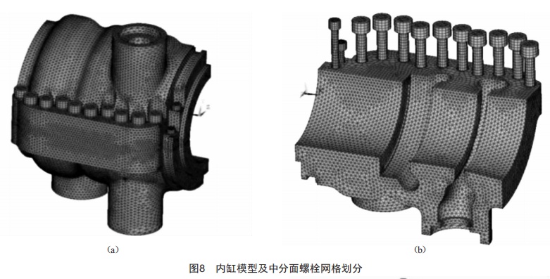 內(nèi)缸由上、下兩半和多個(gè)中分面螺栓組成。螺栓的材料為NiCr20TiA1,其屈服極限為520MPa。兩半內(nèi)缸腔室劃分如圖7所示,每個(gè)腔室對(duì)應(yīng)的溫度壓力與表2保持一致。內(nèi)缸模型及中分面螺栓網(wǎng)格劃分如圖8(a)、圖8(b)所示。