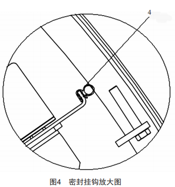 本方案在滿足常規(guī)帶式輸送機(jī)基礎(chǔ)上加裝緊身封閉防護(hù)罩的同時(shí),也可實(shí)現(xiàn)帶式輸送機(jī)的全封閉,如圖3所示,當(dāng)帶式輸送機(jī)改變傳統(tǒng)托銀組,采取側(cè)托銀與側(cè)滑板相配合的模式時(shí),可加裝如圖4所示的密封掛鉤,保證其密封性。