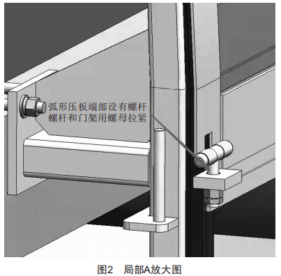 上護(hù)罩連接邊緣則通過(guò)弧形壓板9壓緊,弧形壓板端部設(shè)有擰緊裝置,如圖2所示,通過(guò)螺母將螺桿和門架拉緊,薄墊片的設(shè)置可有效防止螺栓松動(dòng)。銷子與螺栓頂部結(jié)構(gòu)相配合,加強(qiáng)固定。開啟時(shí),打開連接裝置,即拆除弧形壓板端部的螺桿螺母,銷子可便捷地從螺栓頂部結(jié)構(gòu)中抽出,完成拆卸分離。在帶式輸送機(jī)下方仍可設(shè)混凝土排水槽,內(nèi)部預(yù)留有空間,可安裝消防系統(tǒng)、自動(dòng)沖洗系統(tǒng)等,護(hù)罩整體采用透明的聚碳酸酯(PC)實(shí)心耐力板進(jìn)行緊身封閉,底部和土建結(jié)構(gòu)結(jié)合部分設(shè)計(jì)擋水圍堰,頂部可設(shè)消防噴霧。緊身封閉防護(hù)罩強(qiáng)度考慮當(dāng)?shù)仫L(fēng)載荷作用,固定支撐部分的設(shè)計(jì)保證有抵抗30m/s風(fēng)速的能力,后期可通過(guò)風(fēng)洞試驗(yàn)進(jìn)一步驗(yàn)證。