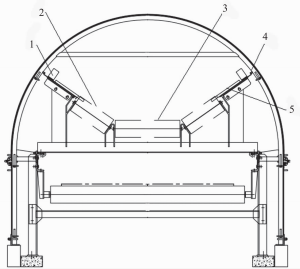 封閉式帶式輸送機(jī)的托銀支架按照一定的間隔布置,支撐結(jié)構(gòu)兩側(cè)采用傳統(tǒng)的帶式輸送機(jī)支架,兩側(cè)托銀進(jìn)行創(chuàng)新,中間仍保留水平托銀,側(cè)部設(shè)計(jì)跑偏保護(hù)擋輪,也可以采用側(cè)板與滑板垂直的結(jié)構(gòu)形式。